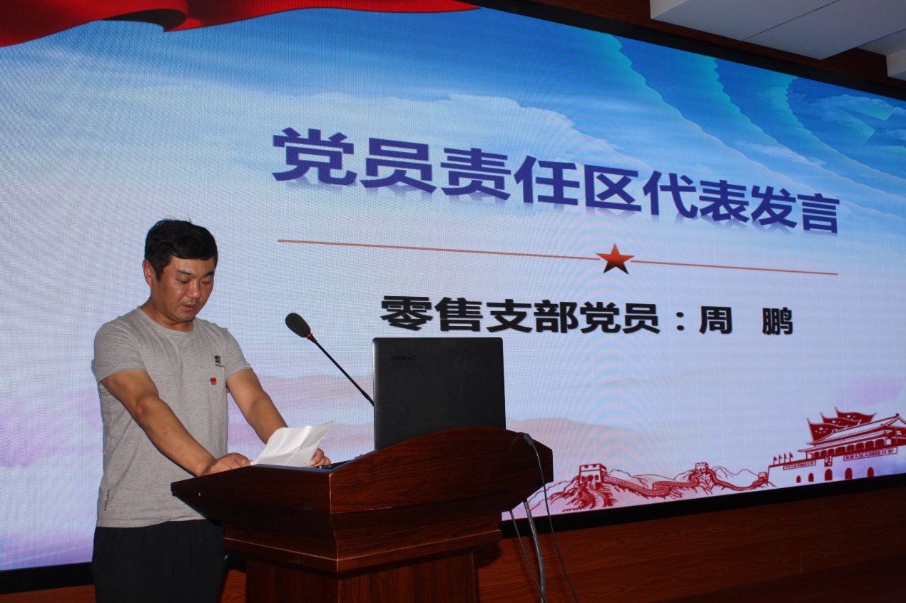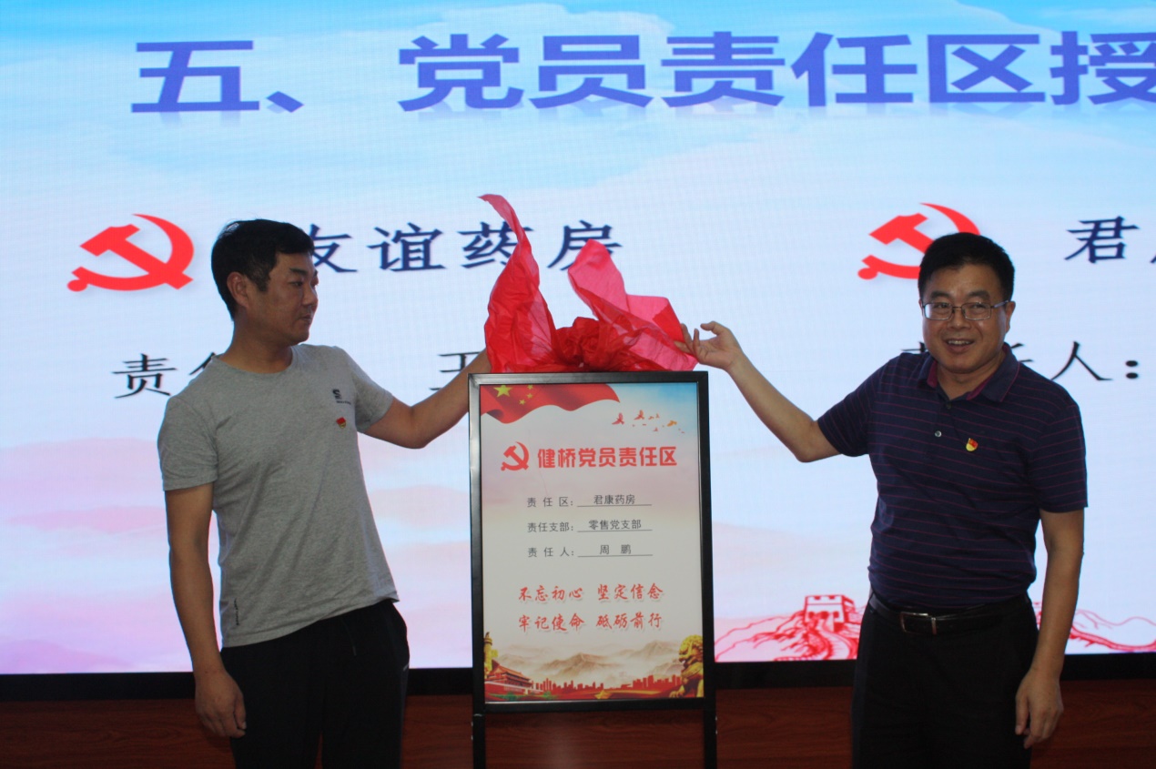 會議最后,公司黨委委員、零售連鎖公司總經(jīng)理徐偉為新設(shè)立的兩個黨員責(zé)任區(qū)友誼藥房和君康藥房授牌,責(zé)任區(qū)代表周鵬就如何立足本職崗位、發(fā)揮黨員先鋒模范作用作了發(fā)言。